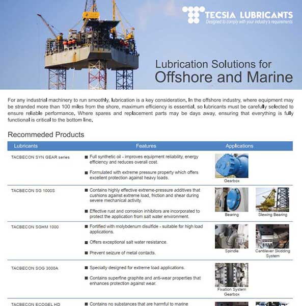 In marine and offshore industry, where equipment may be stranded more than 100 miles from the shore, maximum efficiency is essential. Hence, lubricants must be selected wisely in order to ensure reliable and effective performance. Where replacement and spare parts may be days away, ensuring that everything is fully functional is critical to the bottom line. Tecsia Lubricants offers the most comprehensive range of long service life specialty lubricants for mission critical equipment.